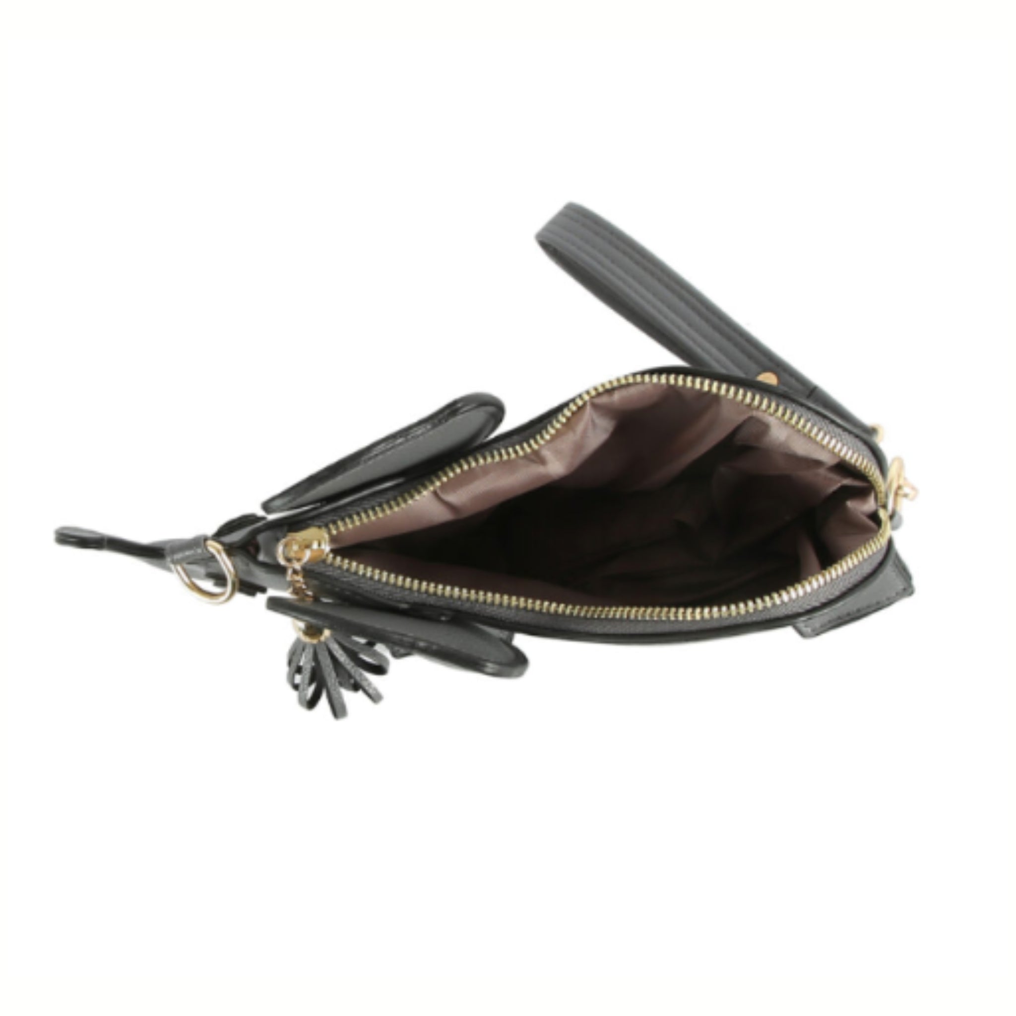 Zip top closure. Detachable wristlet and crossbody strap included. 6.5″LX 2.8″W X 8″H.