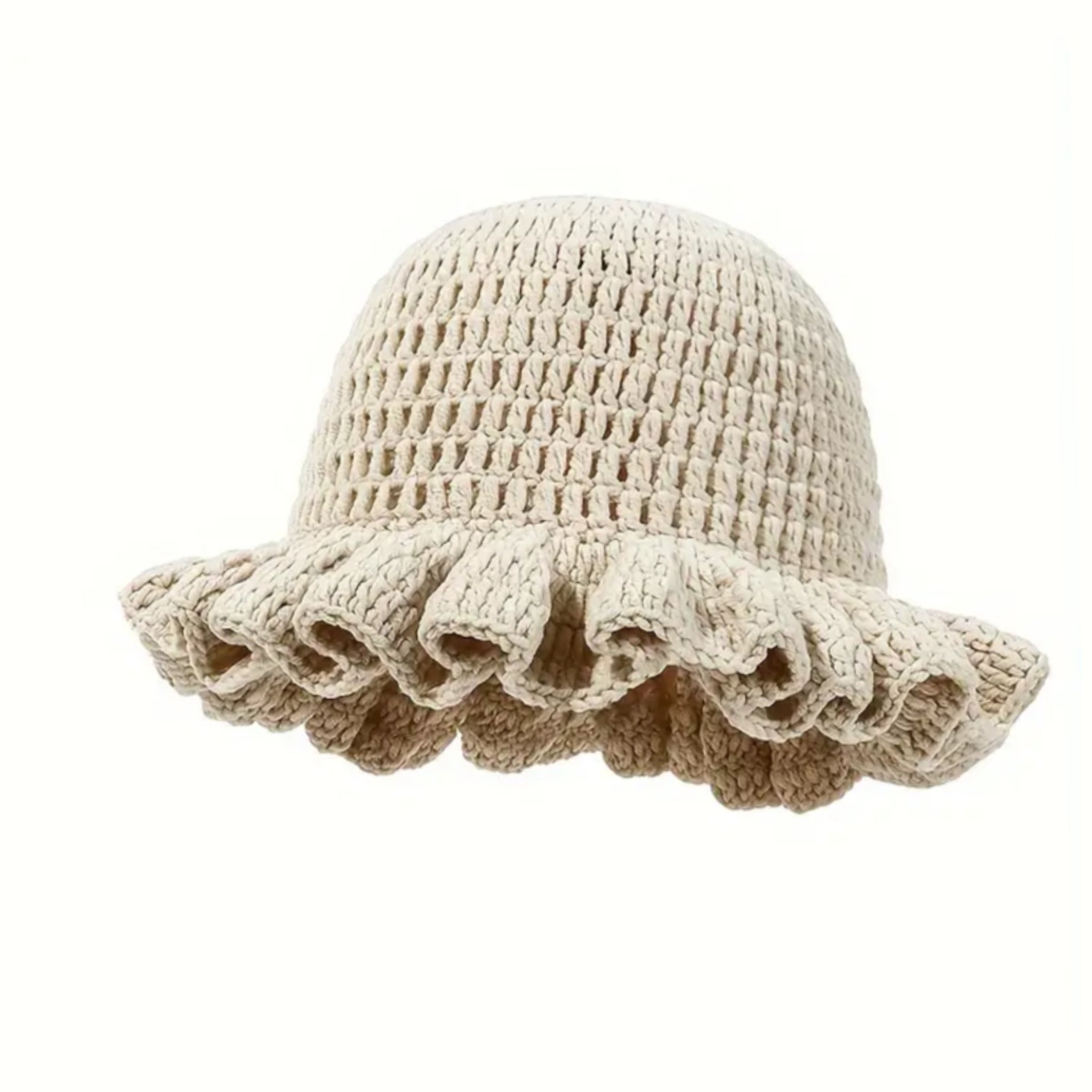 Bone Crochet Ruffle Hat. As Shown. 58cm Circumference. One size fits most.