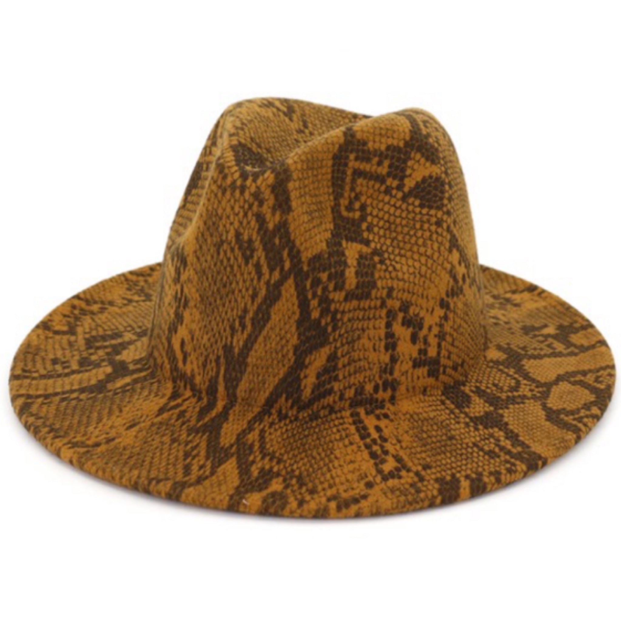 Unisex Brown Snakeskin Felt Fedora. 65% Cotton/35% Polyester. Adjustable lining 56 cm - 58 cm.